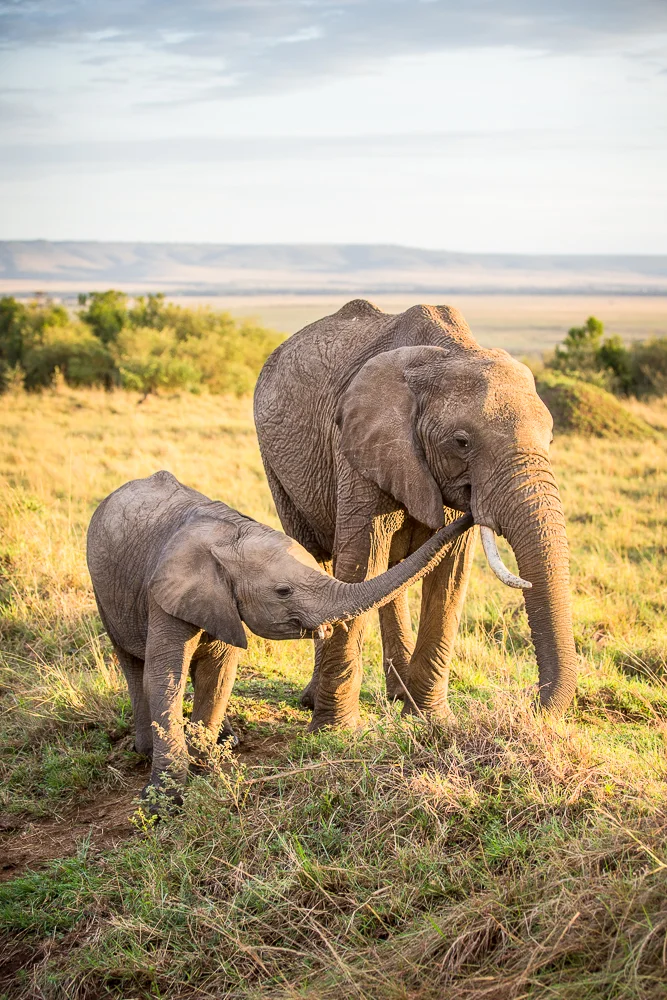 A young elephant frolics, seemingly without a care in the world, in the early morning sunlight under the protective shadow of its mother. Photographed in Maasai Mara National Park, Kenya.